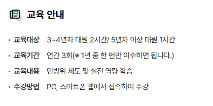 교육은 보통 5개 정도의 동영상 강의로 구성되어 있어요. 하나당 약 10~15분 정도이고, 총 1시간 내외의 교육을 시청해야 해요. 중요한 건! 중간에 영상 넘기기나 빨리 감기는 안 된다는 점! 백그라운드로 돌려두고 딴 짓하면 진행이 멈추기도 하니까, 주의해야 해요.