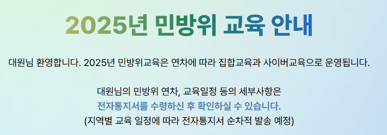 보통 3년차 이상 민방위 대원들은 집합교육 대신 사이버교육으로 대체되며, 지역별 민방위 사이버교육 홈페이지에서 제공됩니다.